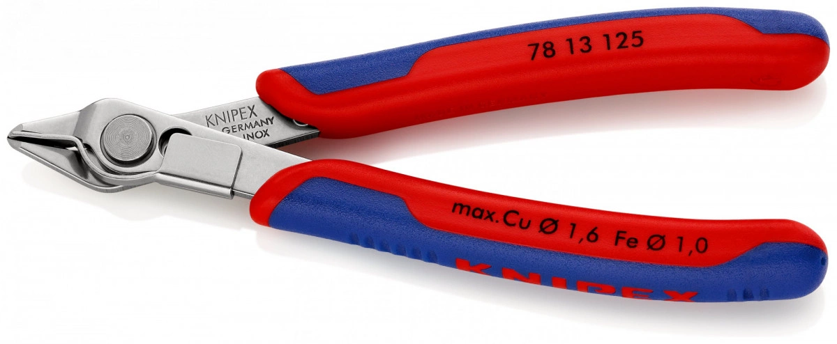 Electronic Super Knips кусачки прецизионные для самых тонких работ по резанию, например, в электронике и точной механике. шлифованные, очень острые режущие кромки без фасок. Прецизионные кончики режут заподлицо проволоку диаметром от 0,2 мм. Рез с контролируемым смещением режущей кромки - для увеличения срока службы и высокоточной резки самых тонких проводов. шарнир с заклепкой из легированной стали. исключительно легкий ход для работы с минимальным утомлением. с раскрывающей пружиной и ограничителем раскрытия. с зажимом для проволоки - никакого случайного отскока отрезанных кусков проволоки. Твёрдость режущих кромок примерно 54 HRC. INOX - инструментальная сталь