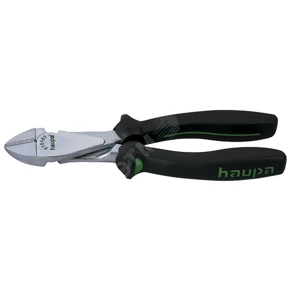 Кусачки для перекусывания мягкой и твердой проволоки, проводов или кабелей небольшого диаметра, специальная инструментальная сталь, кованая, индуктивное закаливание режущих кромок, хромирование для защиты от коррозии с рычажной передачей, усовершенствованная характеристика резки, двухкомпонентные рукоятки с упорами для защиты от соскальзывания