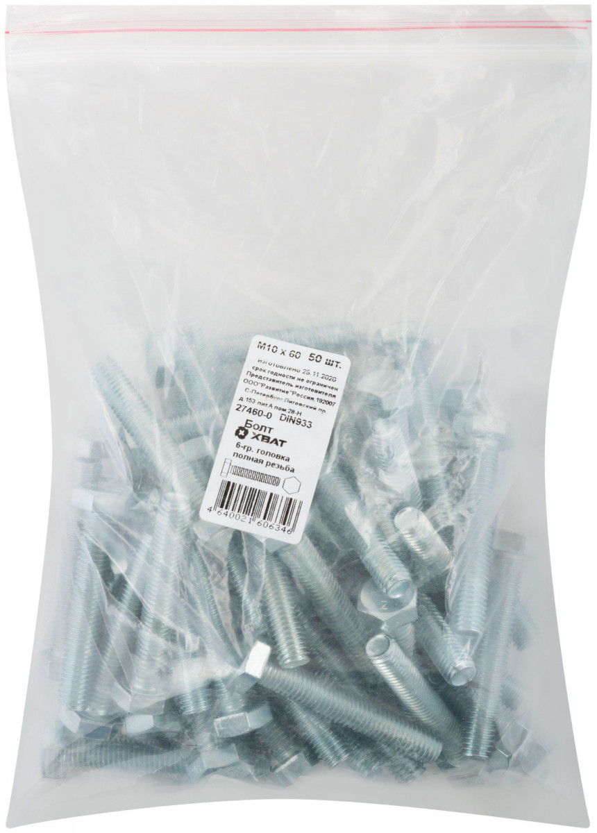 Болт DIN933 М10х60 шестигранная голова полная резьба оцинкованный (50 шт)