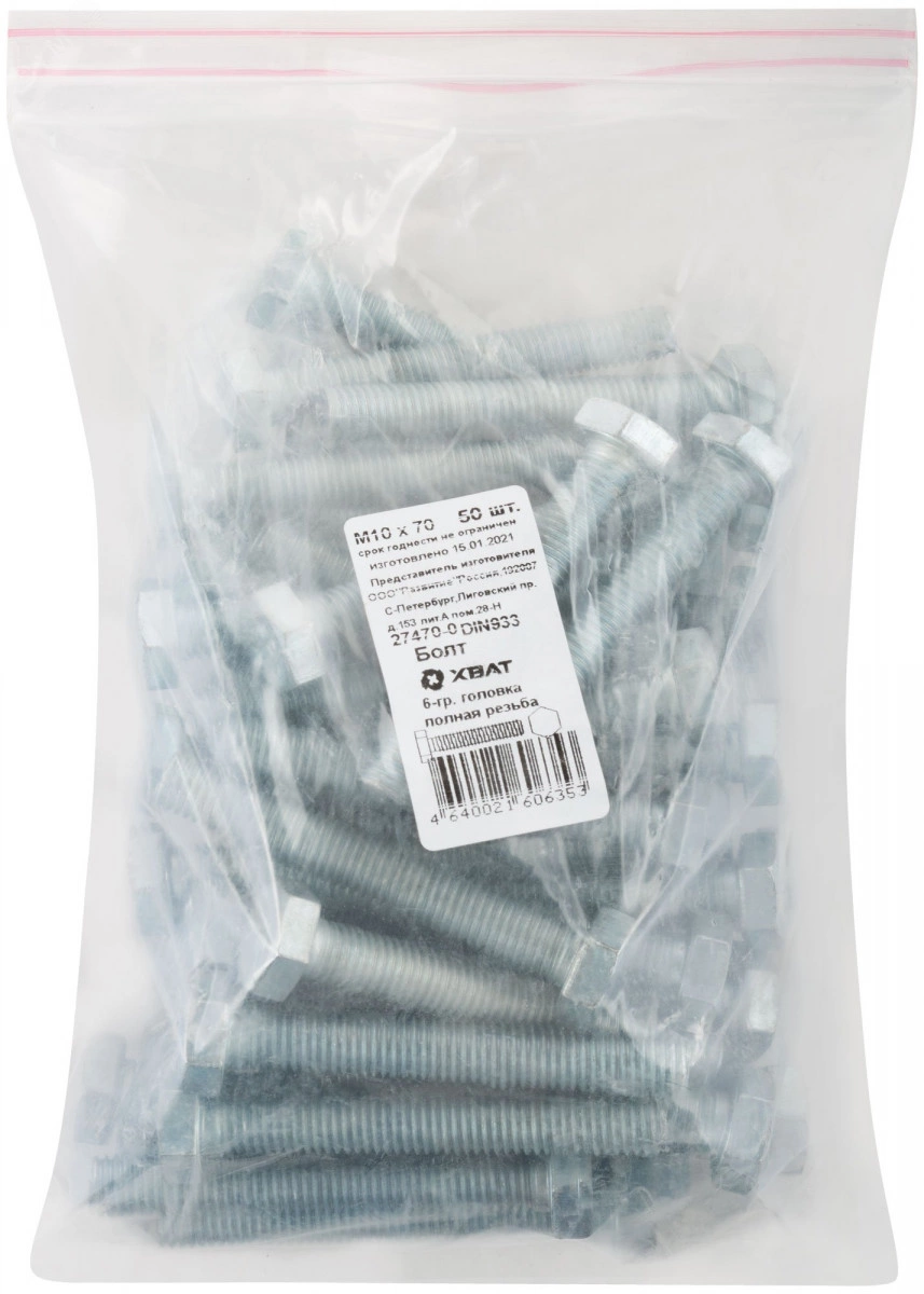 Болт DIN933 М10х70 шестигранная голова полная резьба оцинкованный (50 шт)