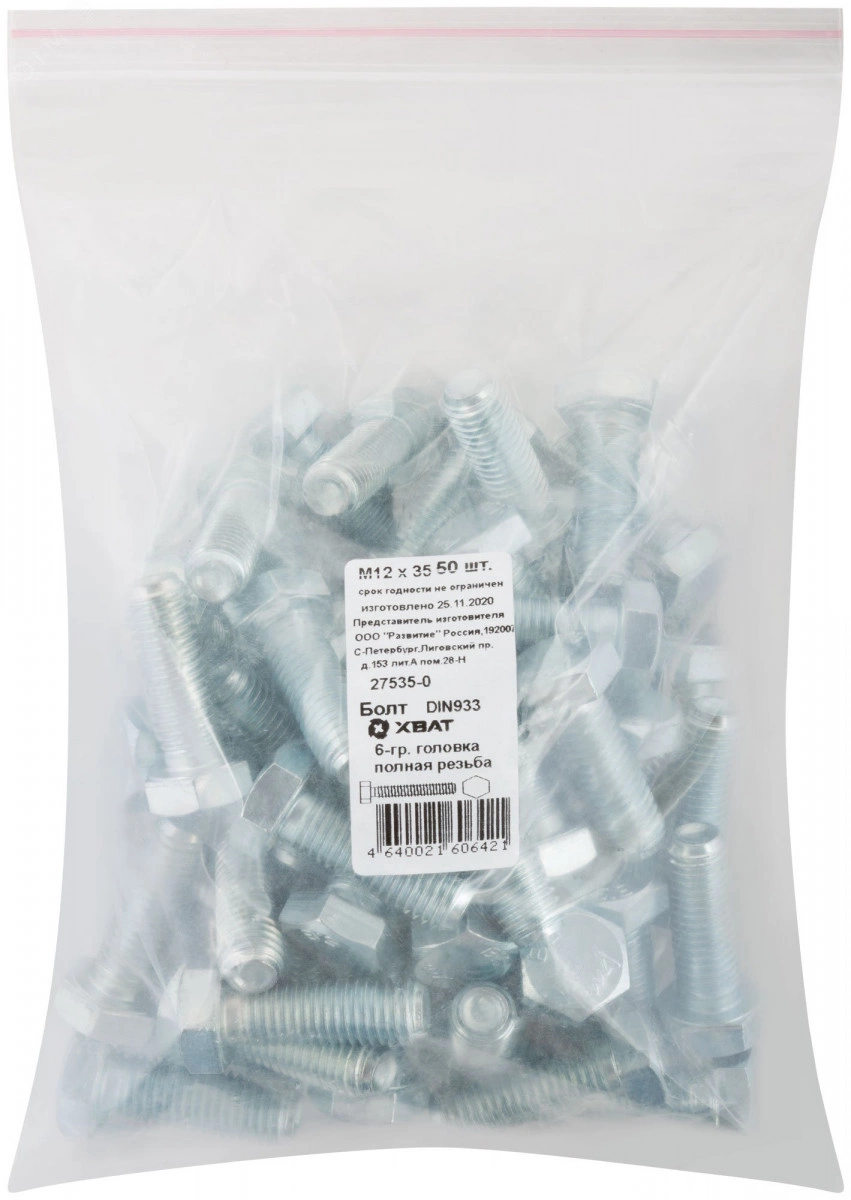 Болт DIN933 М12х35 шестигранная голова полная резьба оцинкованный (50 шт)
