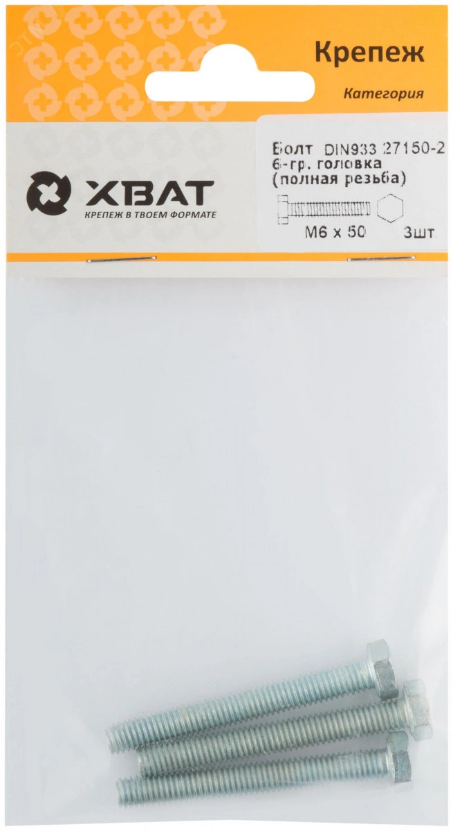 Болт DIN933 М6х50 шестигранная голова полная резьба оцинкованный (3 шт)