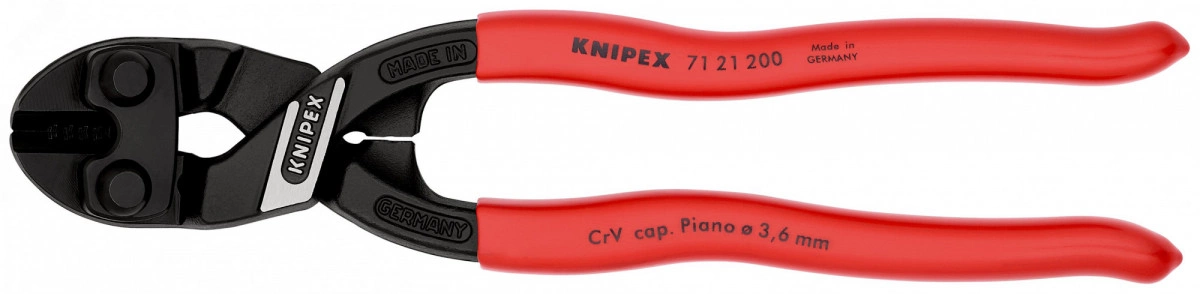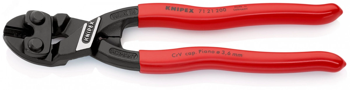 71 21 200 SB KNIPEX CoBolt с прецизионными режущими кромками для резания мягкой и твердой проволоки, а также рояльной струны. режет болты, гвозди, заклепки и т.д. до 5,2 мм. особо высокая режущая способность при меньшей затрате усилий благодаря высокоэффективной конструкции шарнира. режущие кромки дополнительно закалены токами высокой частоты до твердости примерно 64 HRC. Головка под углом 20° с обращённым на одну сторону узлом крепления и смещёнными кромками для резания практически вровень с поверхностью, инструмент удобно держать. карта самообслуживания/ блистер. - Параметры резания/ мягкая проволока (диаметр) - 6mm - Параметры резания/проволока средней твёрдости (диаметр) - 5,2mm - Параметры резания/ твёрдая проволока (диаметр) - 4,0mm - Параметры резания/ рояльная струна (диаметр) - 3,6mm