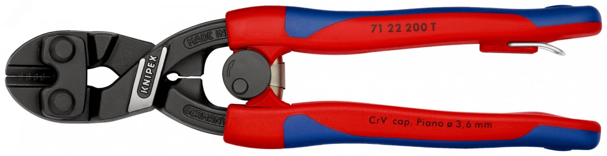 Болторез COBOLTкомпактный с пружиной голова 20° рез: мягкая проволока 6 мм проволока средней твёрдости 52 мм твёрдая проволока 4 мм рояльная струна (HRC 59) 36 мм L-200 мм чёрный 2-компонентные рукоятки крепление для страховки блистер KN-712
