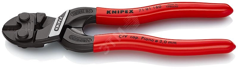 71 01 160 SB KNIPEX CoBolt S Особо высокая режущая эффективностьинструмента при комфортной длине 160 мм. Маленькая, тонкая головка для ограниченного доступа к детали. Компактный и мощный - режет болты, гвозди, заклёпки диаметром до 4,4 мм. Лезвия с закалкой токами высокой частоты, рассчитанные на высокую нагрузку, для тонкой, твёрдой проволоки, винтов, пружин, твёрдость режущих кромок около 64 HRC. Меньше усилий благодаря эффективным рычагам. Разрезаемый материал не проскальзывает благодарялазерной заточке на лезвиях. Специальная площадка под шарниром для захвата и протяжки проволоки диаметром свыше 1,0 мм. карта самообслуживания/ блистер. - Параметры резания/ мягкая проволока (диаметр) - 5,3mm - Параметры резания/проволока средней твёрдости (диаметр) - 4,4mm - Параметры резания/ твёрдая проволока (диаметр) - 3,2mm - Параметры резания/ рояльная струна (диаметр) - 3,0mm