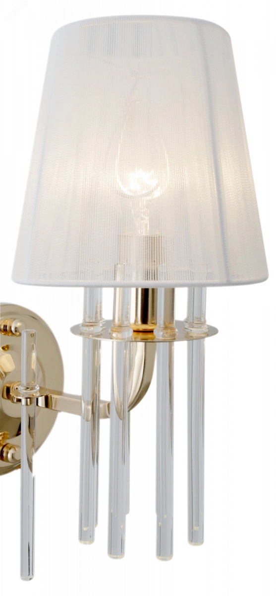 "Бра Rivoli Lilith - светильник настенный цвета французское золото с тканевым абажуром и декоративными стеклянными колбами. Бра настенное Lilith освещает площадь 3 м2 и идеально для организации дополнительного освещения в спальне, в гостиной. Ткань бра - специальная абажурная, не скапливает пыль, устойчива к выцветанию и загрязнениям. Полупрозрачная текстура абажура бра отлично пропускает свет. Рекомендованная лампа - Е14 40 Вт.  Настенные светильники Lilith выпущены итальянским брендом Rivoli и входят в дизайнерскую серию ""Хрусталь"". Их лаконичный металлический корпус имеет стойкое гальваническое покрытие теплого золотого оттенка. Светильники Lilith - прекрасный вариант бра для интерьеров в стиле модерн, классика, современная классика. Хрустальные декоративные элементы отличаются кристально чистой прозрачностью, создают интересную игру света и оставляют яркое впечатление.  "