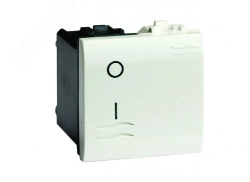 Выключатель двухполюсный. Назначение- включение/выключение освещения. Характеристики- номинальный ток ? 16 А, номинальное напряжение ? 250 B. Кол-во модулей- 2. Цвет- белый