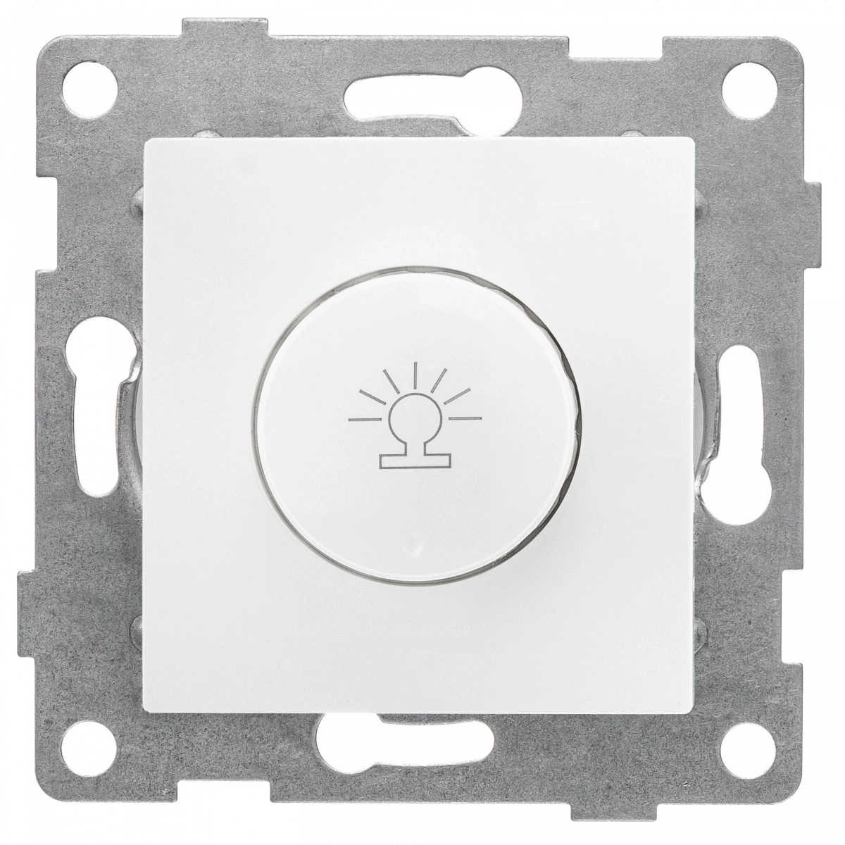 Механизм диммера предназначен для коммутации и регулирования яркости ламп накаливания и галогеновых ламп. При повороте ручки регулятора происходит регулирование, в крайнем левом положении выключение. Устанавливается в монтажные коробки или специальные монтажные полости при скрытой проводке электрических сетей. Диммер позволяет производить монтаж, как при помощи распорных лапок, так и на резьбовые элементы в монтажной коробке.