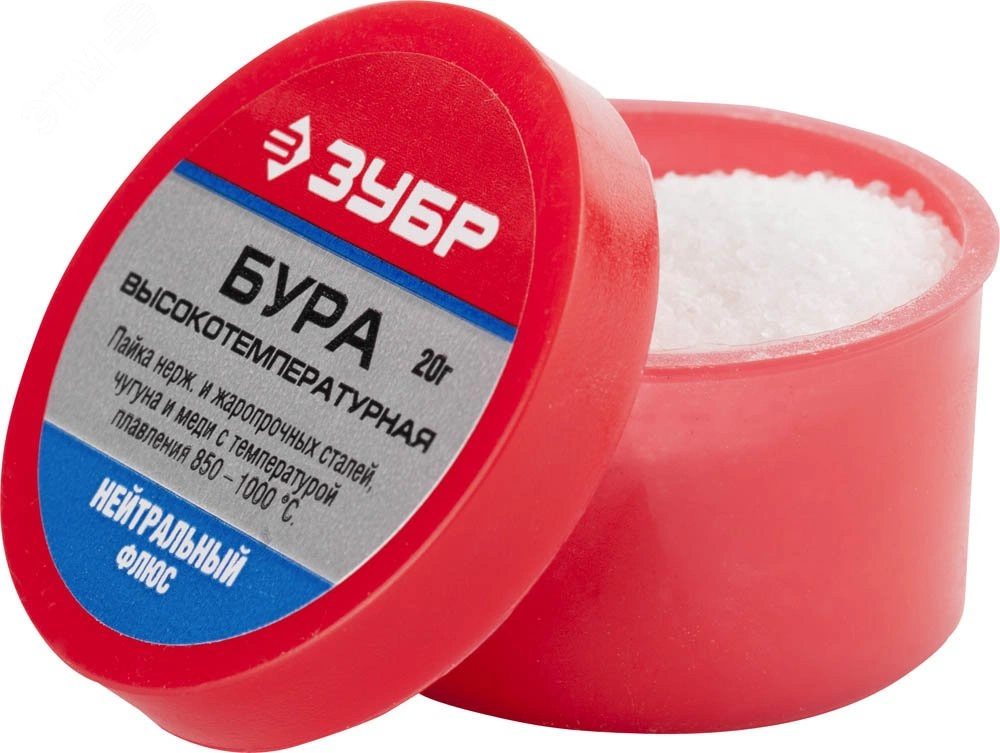 Флюс Бура применяется для пайки обычных металлов с благородными (золото, серебро, мельхиор). В расплавленном состоянии способен растворять оксиды металлов. Требует промывки горячей водой.
