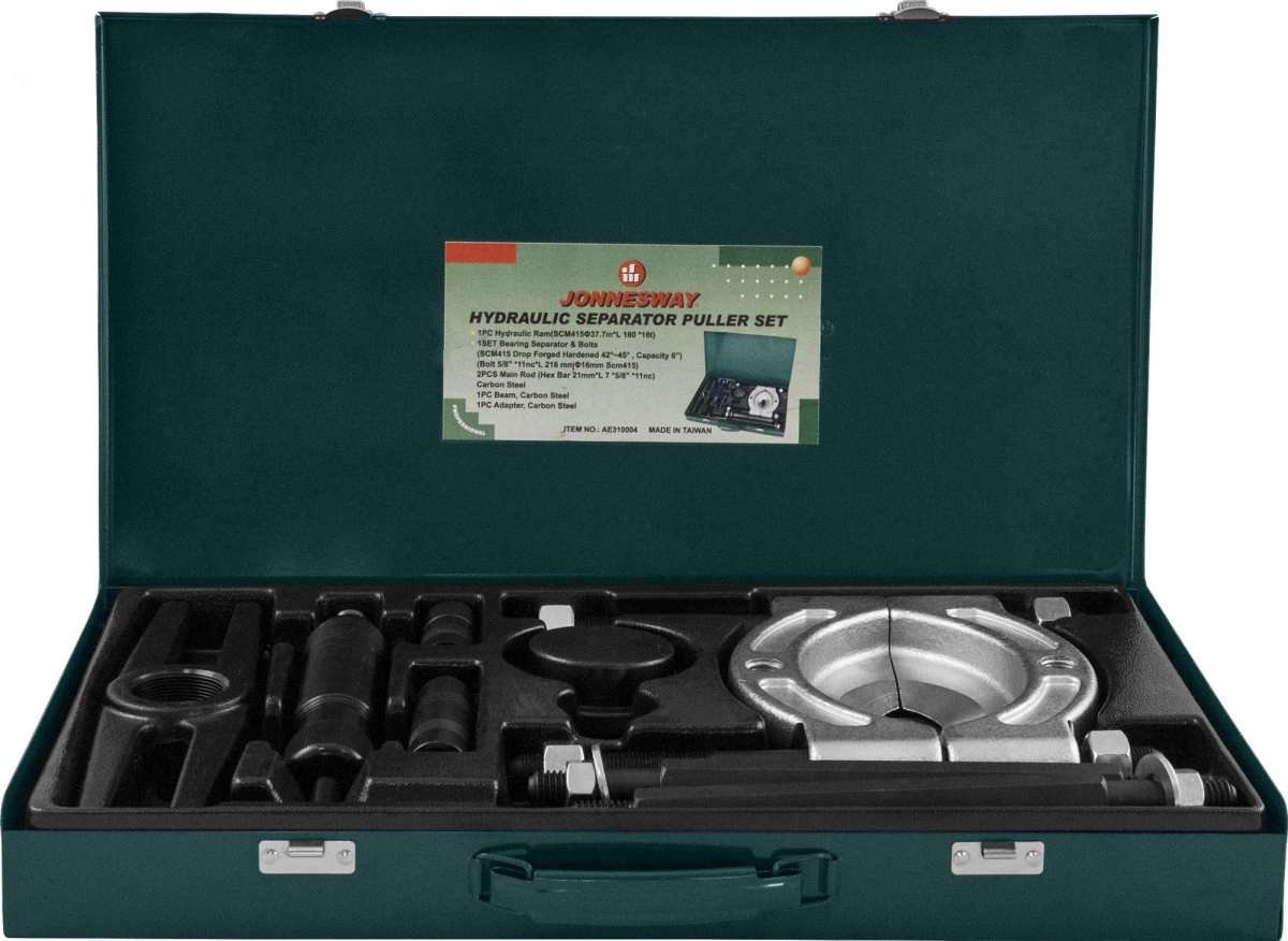 Съемник-сепаратор с комплектом деталей для тянущей части, где в качестве исполнительного механизма, вместо ходового винта, используется гидравлический цилиндр, развивающий большее тяговое усилие, позволяющее применять съемник для проведения демонтажных работ с особонагруженными деталями. Исполнительный механизм гидравлического цилиндра расчитан на максимальное усилие в 10 т. Превышение максимального усилия может привести к поломке механима. Захваты съемника изготовлены из легированной углеродистой стали, закаленной до твердости HRC 42-45, позволяют обслуживать детали в диапазоне размеров от 105 до 150 мм, расположенных на расстоянии до 300 мм от опорной поверхности. Детали тянущей части изготавливаются из углеродистой стали, обеспечивающей работоспособность изделия при его применении. Для удобства, детали набора хранятся в оригинальном металлическом ящике.