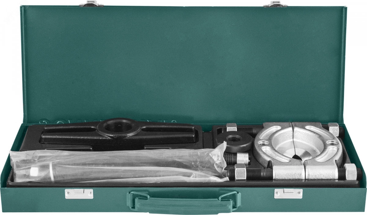 Комплект съемника-сепаратора с набором элементов для сборки тянущей части, обеспечивающей применение съемника на демонтируемой детали, расположенной на расстоянии до 275 мм от опорной поверхности. Рабочий диапазон сепаратора 75-105 мм. Захваты изделия изготовлены, методом ковки, из легированной углеродистой стали, закаленной до твердости HRC 42-45. Детали тянущей части, из углеродистой стали, обеспечивающей надежность конструкции. Для удобства, детали набора хранятся в оригинальном металлическом ящике.