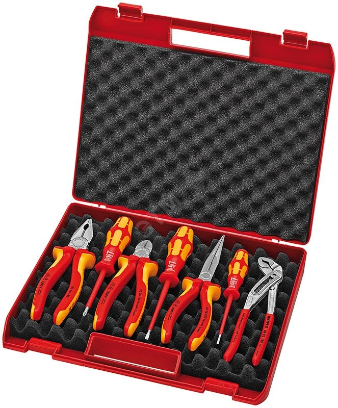 00 21 15 RED Electric Set 2, ящик для инструментов универсальный чемодан высокого качества из ударопрочного пластика. пенопластовый вкладыш с сотовой структурой для различных комплектаций. Наружные размеры (Ш x В x Г) - 340 x 56 x 275 мм. все инструменты за исключением клещей сантехнических испытаны на электробезопасность в соответствии со стандартом DIN EN 60900. Комплект поставки - 1 x 03 06 180 KNIPEX Плоскогубцы комбинированные, 1 x 88 03 180 KNIPEX Alligator Клещи переставные, 1 x 70 06 160 KNIPEX Бокорезы, 1 x 26 16 200 KNIPEX Длинногубцы с режущими кромками (Длинногубцы с прямыми полукруглыми длинными губками, с режущей кромкой), 1 x 006100 Wera Отвертки для винтов с шлицевыми головками 160i (0,4 x 2,5 x 80 mm), 1 x 006152 Wera Отвертки, для винтов с профилем Phillips 162i PH (PH1 x 80 mm), 1 x 006115 Wera Отвертки для винтов с шлицевыми головками 160i (0,8 x 4,0 x 100 mm),