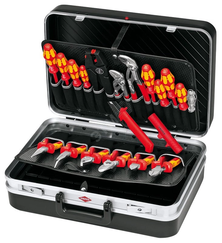 Инструментальный чемодан Vision24 набор электрика укомплектован 20 инструментами известных производителей. Макс. нагрузка - 20 кг. Объем - 24 литра. разнообразные варианты оформления пространства за счёт использования вставок в днище глубиной 60 мм и накладной панели с шестью большими карманами для инструментов. надёжные шарниры с самофиксацией при необходимости удерживают крышку в открытом положении даже с инструментами. Прочная, эргономичная ручка с фиксацией под углом 90 градусов. Съемная инструментальная панель с 15 карманами на нижней стороне и 6 карманами для инструментов, а также отделением для струбцин (ширина 400 мм) сверху, фиксация кнопкой. два запираемых замка надёжно защищают содержимое от кражи. алюминиевая двойная рама по периметру. сделан из прочного пластика ABS, черного цвета. Крышка и инструментальная панель из двойного грязеотталкивающего полипропилена.