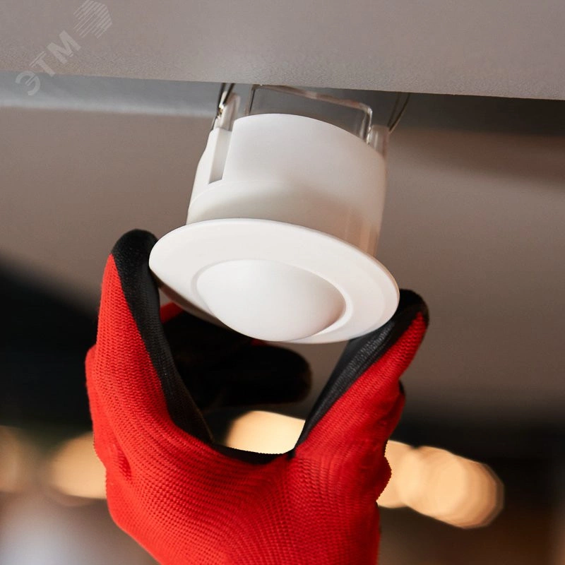 Микроволновый датчик движения излучает высокочастотные электромагнитные волны (частота волн может быть различной в зависимости от производителя, обычно она составляет 5,8 ГГц), которые отражаясь от окружающих объектов регистрируются сенсором и в случае обнаружения малейших изменений отраженных электромагнитных волн, микропроцессор устройства приводит в действие заложенную в него функцию. Встраивается в подвесной потолок с диаметром установочного отверстия 60 мм. Визуально датчик гармонично встраивается в обстановку и не выделяется на потолке.
