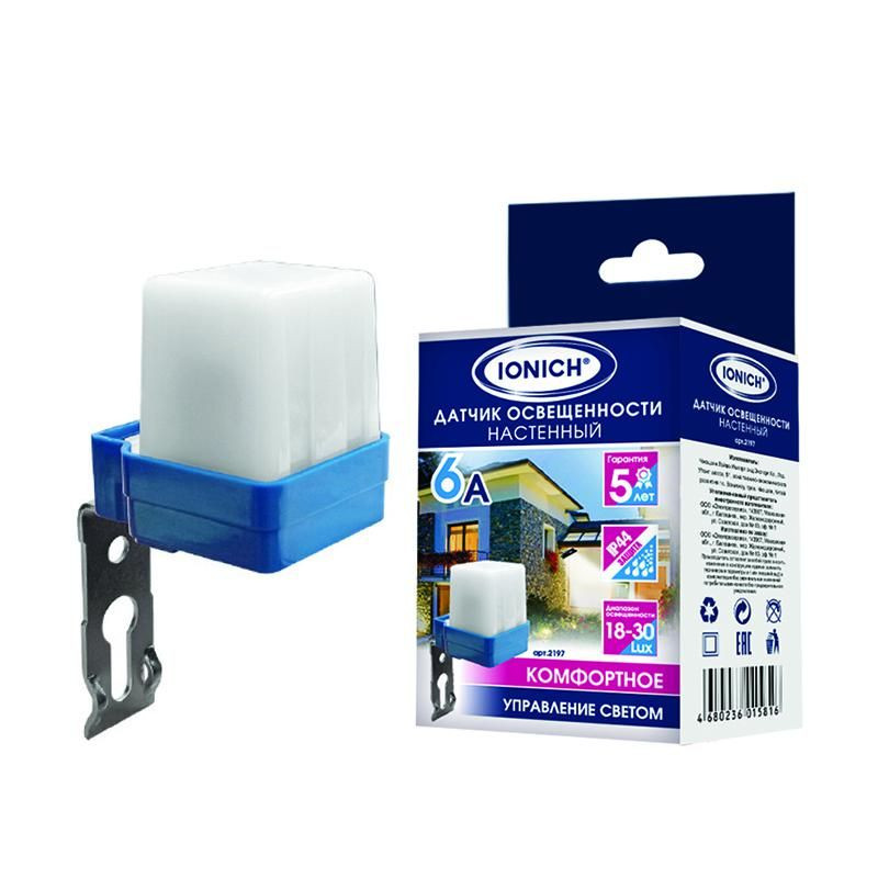 Полное описание: Датчик освещенности настенный 6А 8-30 Lux бел. IONICH 2197