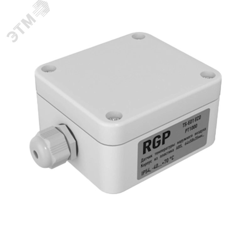 TS-E01 ECO IP65 - Наружный датчик температуры в литом корпусе из ABS- пластика, подходит для применения в качестве уличного датчика для систем вентиляции, отопления и теплоснабжения, датчик температуры защищен от воздействия окружающей среды по стандарту IP65. Измерительный элемент размещается на боковой стенке корпуса, что позволяет нивелировать влияние температуры стен зданий на показания датчика. Измерительные элементы могут быть с прямой (PTC-элементы - Pt1000) или с обратной зависимостью (NTC-элементы - NTC10k) от температуры. Наружный датчик состоит из пластикового корпуса с интегрированным сальником для ввода кабеля. Внутри корпуса находится измерительный элемент и клеммная колодка для подключения кабеля. Маркировка датчика осуществляется с помощью наклейки на его корпусе, внутри корпуса есть дополнительная маркировка с информацией о типе измерительного элемента.