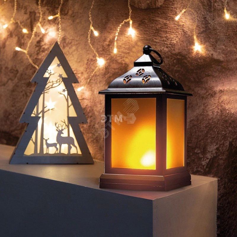 Декоративный фонарь с эффектом пламени свечи в корпусе черного цвета станет прекрасным украшением интерьера, которое гармонично дополнит обстановку, внесет нотку тепла и уюта, подарит ощущение комфорта хозяевам и гостям. В центре композиции находится небольшая пластиковая свеча, которая светится теплым белым светом и имитирует мерцание настоящего пламени. Светодиод получает питание от 2 батареек типа АА. Декоративный фонарь — это замечательный подарок к празднику, который вызовет улыбку и оставит приятные воспоминания.