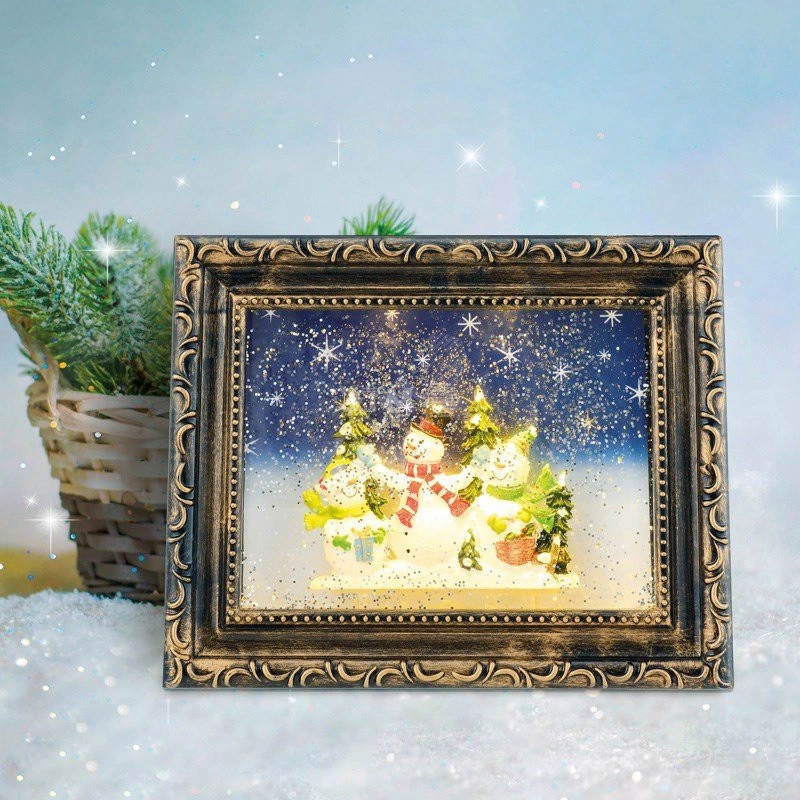 Декоративный светильник ''Картина'' с эффектом снегопада и подсветкой — прекрасный подарок к Новому году или Рождеству, который порадует и детей, и взрослых. Прозрачная колба наполнена жидкостью с металлизированным конфетти, которая начинает циркулировать сразу после включения. Сверкающий вихрь блесток уносит зрителей в волшебную зимнюю сказку, где главные герои — компания снеговиков — фигурки, стоящие в центре. Светильник работает от 3 элементов питания типа АА, что дает возможность использования в любом удобном месте. USB-шнур входит в комплект.