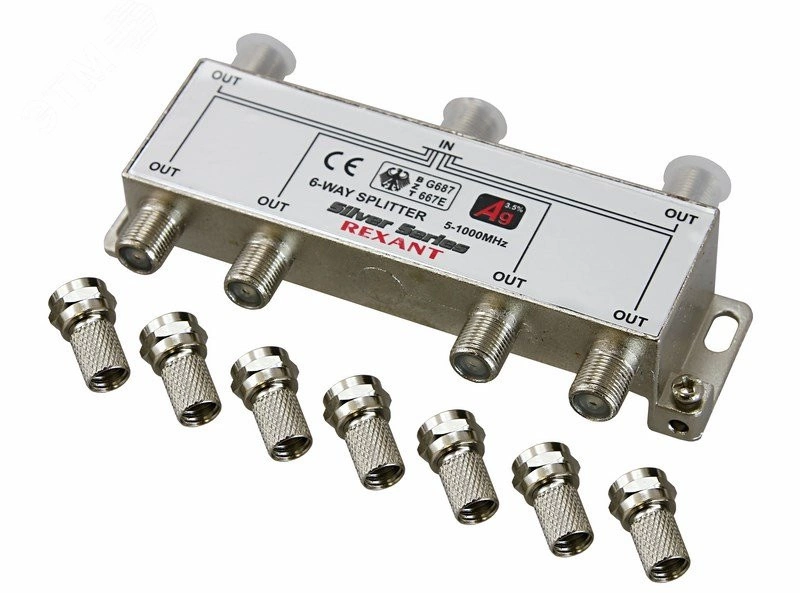 Телевизионный делитель или сплиттер предназначен для телевизионных систем и используется в домах и квартирах, где требуется подключить несколько телевизионных аппаратов к одной антенне. Сплиттер распределяет поступающий на вход сигнал поровну на его выходы, что обеспечивает одинаково четкое изображение на всех подключенных устройствах. Он имеет шесть выходов для сигнала и подключается с помощью стандартных F-Разъемов. Делитель комплектуется необходимыми F-Разъемами. Пайка внутри делителя осуществляется с использованием серебренносодержащего припоя, что позволяет получить сигнал высокого качества и увеличить надежность. Делитель имеет надежный металлический корпус.
