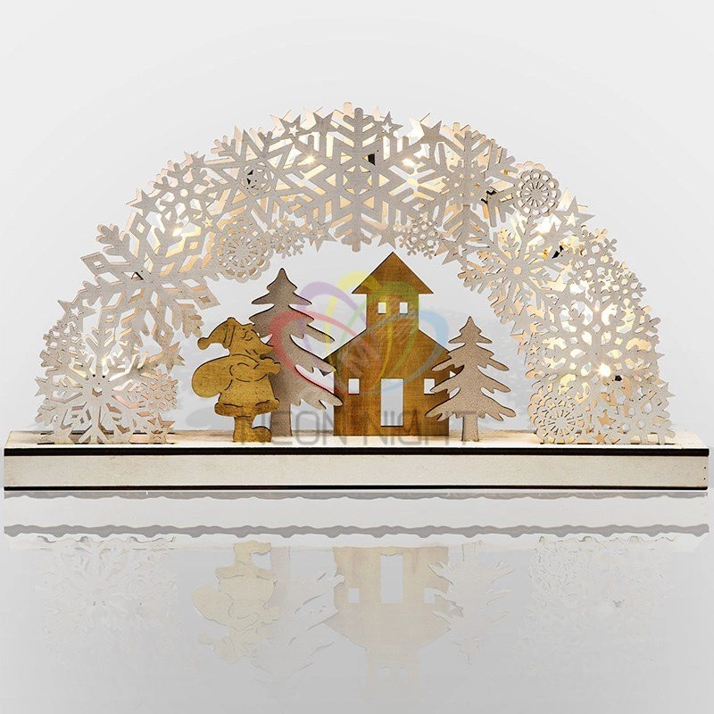 Деревянная фигурка с подсветкой ''Рождественская сказка'' 44,5?6?24 см представляет собой затейливую композицию из фигурок елей, Деда Мороза с мешком подарков и большой радуги из резных снежинок. 7 ярких диодов эффектно подсвечивают декор и питаются от 2 батареек типа ААА. Светодиоды экономичны, долговечны и абсолютно безопасны. Удобная подставка подходит для размещения на любой ровной поверхности. Фигурка ''Рождественская сказка'' — идеальный подарок к Новому году, который порадует и детей, и взрослых.