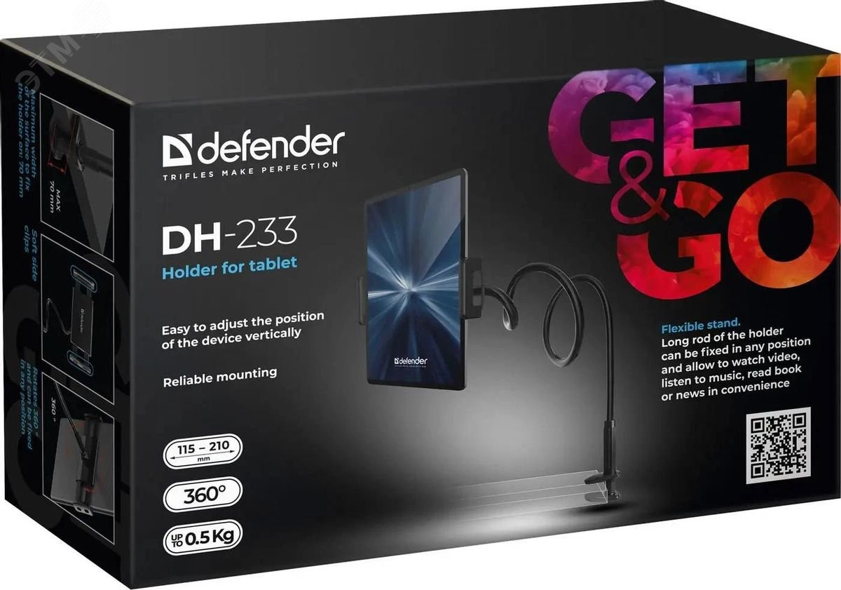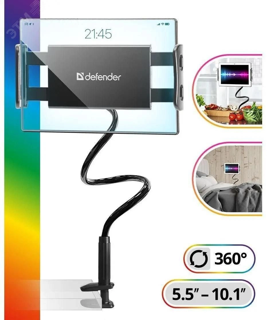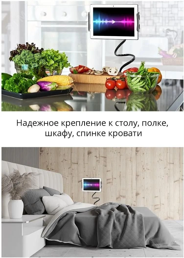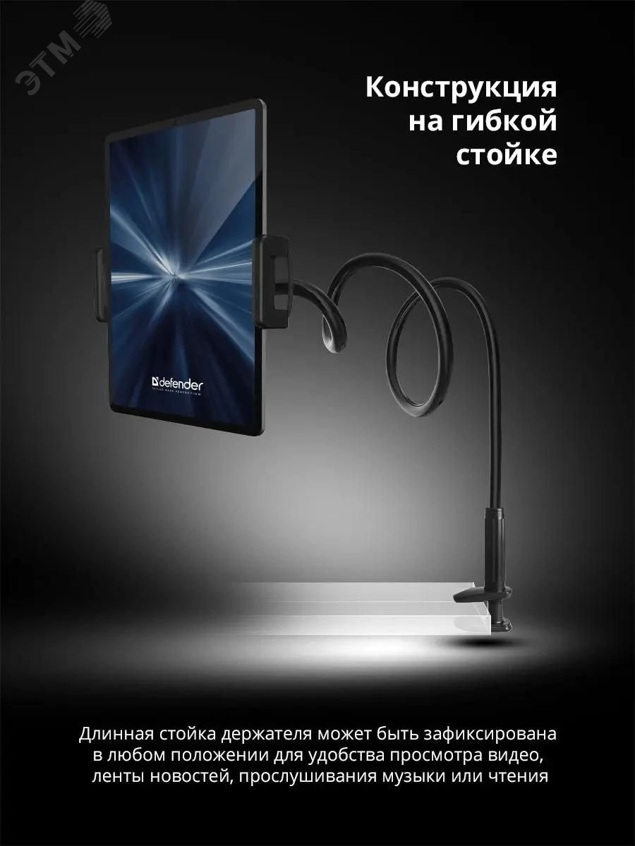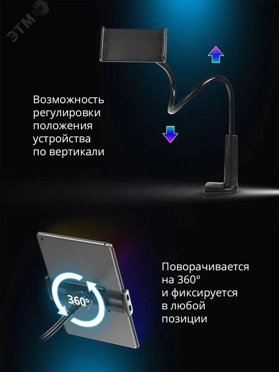 Держатель для планшета DH-233 - универсальный держатель для смартфонов и планшетов. Данная модель оборудована гибкой стойкой, зафиксировать можно в любом удобном положении. Также можно регулировать положение устройства по вертикали. Есть возможность поворота на 360 градусов.