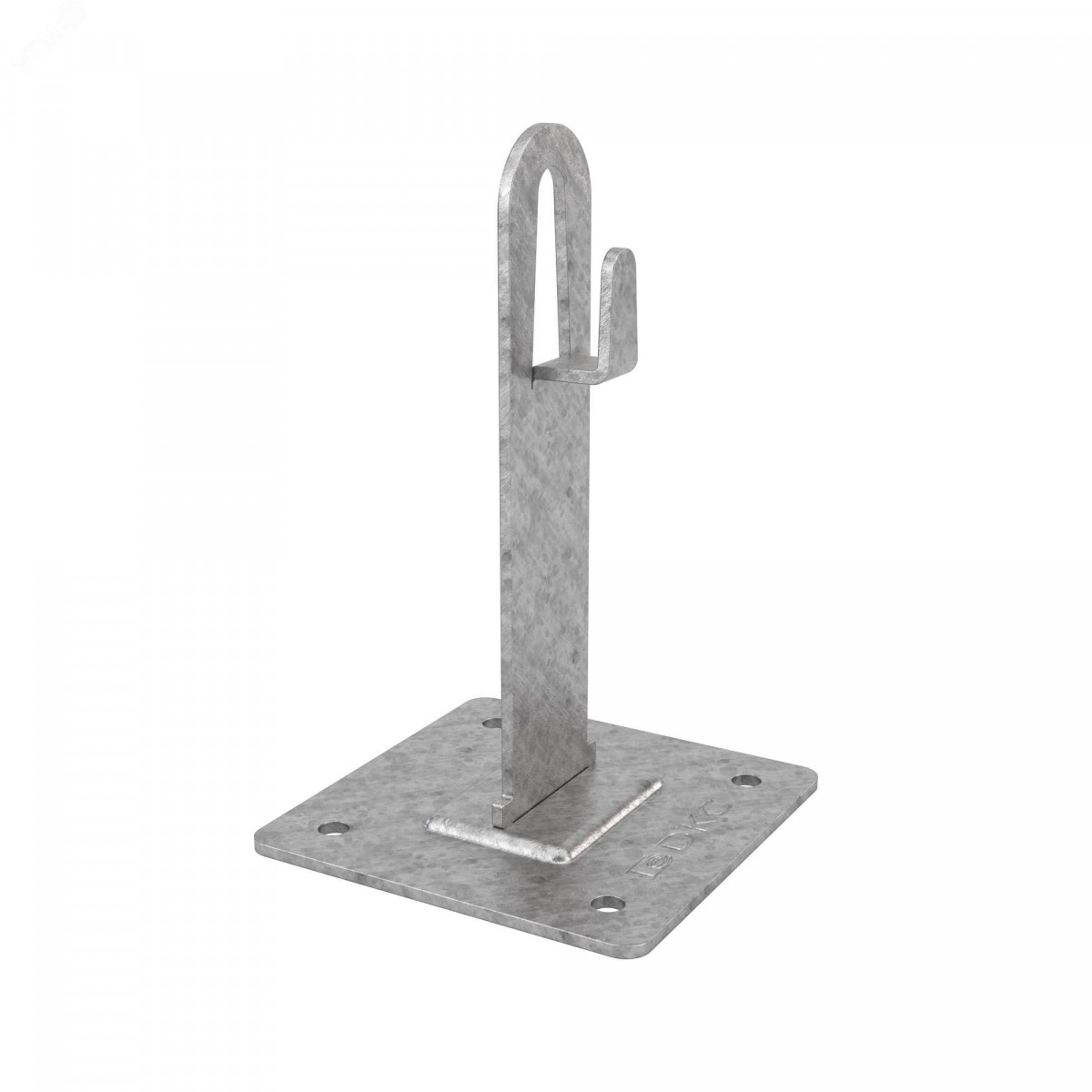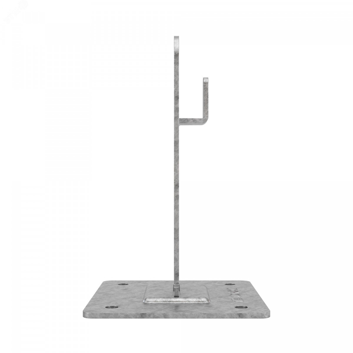 Металлический держатель используется для фиксации молниеприемной сетки на плоской либо скатной кровле при помощи саморезов. Проводник крепится безвинтовым зажимом с применением плоскогубцев. Материал - горячеоцинкованная сталь, высота - 150 мм.