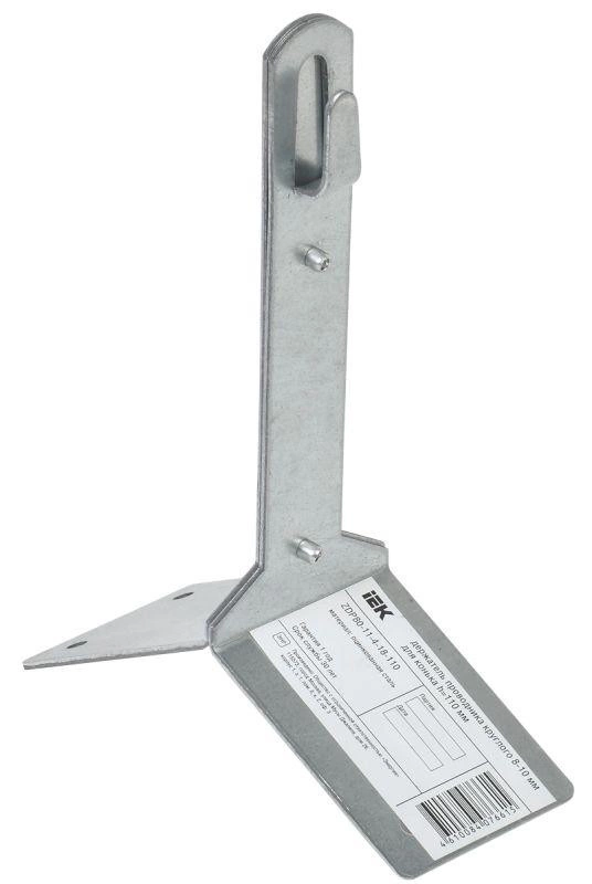 Держатель проводника круглого 8 – 10 мм для конька h = 110 мм товарного знака IEK используется для закрепления прутка молниезащитной сетки на коньке скатной кровли. Позволяет разместить проводник на расстоянии 110 мм от конька. Для крепления на коньке держатель имеет четыре отверстия под винт диаметром 5 мм.