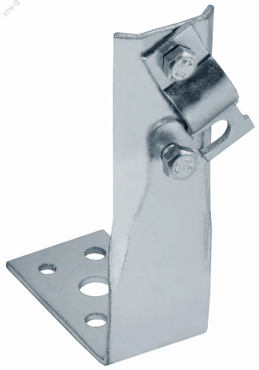 Держатель угловой с болтовым зажимом предназначен для монтажа проводника на горизонтальные, вертикальные или наклонные поверхности. Монтируется на поверхности при помощи саморезов. Зажим проводника происходит при помощи болтового соединения. Материал корпуса - сталь горячеоцинкованная.