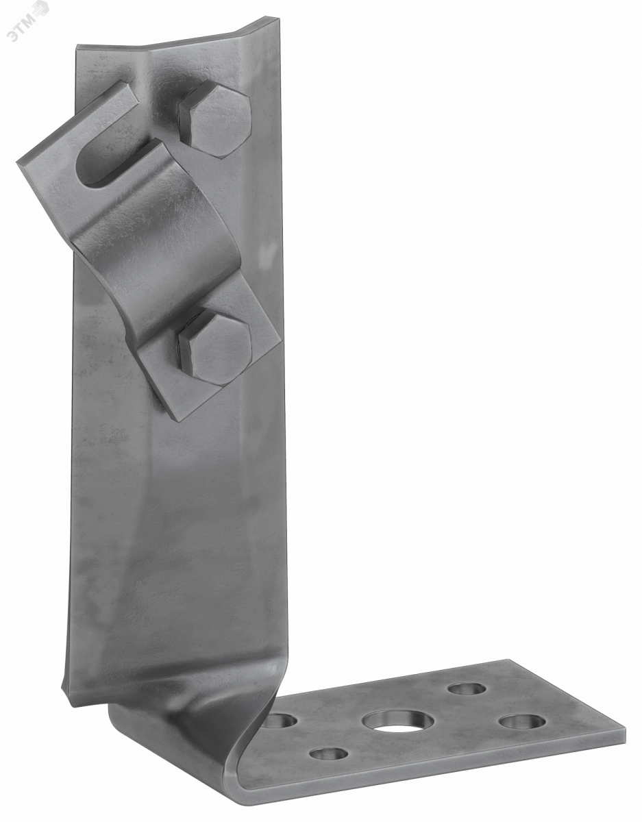 Держатель угловой скрученный с болтовым зажимом предназначен для монтажа проводника на горизонтальные, вертикальные или наклонные поверхности. Скрученная конструкция держателя позволяет крепить проводник на узкие парапеты. Монтируется на поверхности при помощи саморезов. Зажим проводника происходит при помощи болтового соединения. Материал корпуса - сталь с термодиффузионным цинковым покрытием.