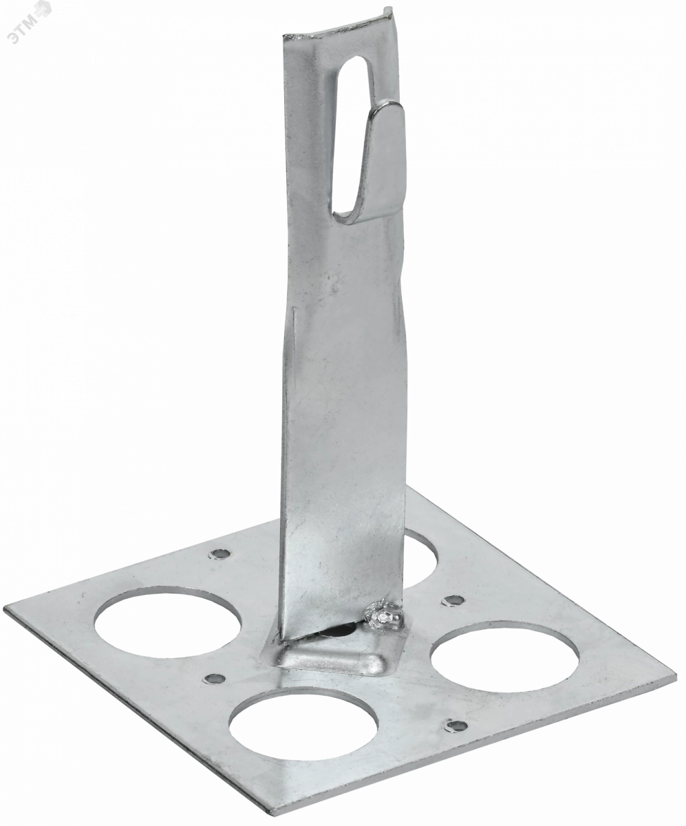 Держатель проводника круглого для плоской кровли с болтовым зажимом предназначен для закрепления прутка на плоской или наклонной кровле. Держатель крепится к кровле при помощи клея. Зажим проводника происходит путем загибания ''язычка'' держателя. Материал корпуса - сталь с гальваническим цинковым покрытием.