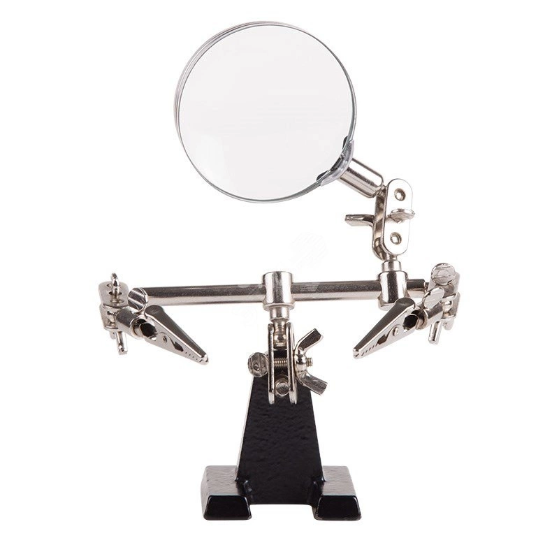 Держатель 'третья рука' с лупой х3 REXANT служит, главным образом, при проведении паяльно-сборочных работ в электронике, ювелирном деле, сборке и ремонте для зажима мелких деталей в любом нужном положении, когда не хватает двух рук. Инструмент состоит из чугунного основания (тяжелая подставка), шарнирного соединения с зажимами типа ''крокодил'' (подвижных во всех плоскостях) с никелевым покрытием и лупы с 3-кратным увеличением (возможность регулировки положения, диаметр линзы 60 мм). С помощью лупы можно будет рассмотреть даже самые мелкие детали.