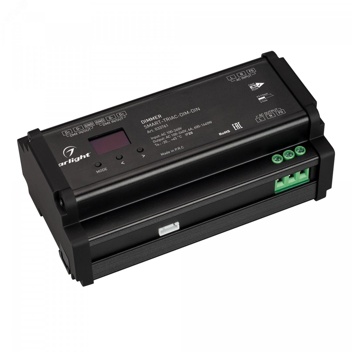 Диммер, предназначенный для включения/выключения и управления яркостью источников света с напряжением питания 230В, таких как- светодиодных диммируемых ламп, диммируемых светодиодных светильников, ламп накаливания и галогенных ламп. Четыре режима работы- ручной (с помощью элементов управления на корпусе устройства), DMX512 и 2.4G. Протокол управления DMX512 с поддержкой RDM. Диммирование выполняется отсечкой фазы сетевого напряжения 230В. Способы управления по переднему и заднему фронту. Возможна установка минимальной яркости 1-40 процентов. Питание от 230В, 1 канал управления, максимальная нагрузка 6А на канал, выходная мощность 1440 Вт для резистивной нагрузки ламп накаливания, 720 В*А для светодиодных источников света. Габариты- 168х93.5х63 мм. Пластиковый корпус черного цвета c LED монитором. Установка на DIN рейку.