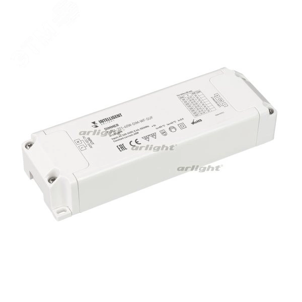 Диммер одноканальный, для светодиодных светильников. Выбор значения выходного тока осуществляется подстроечным резистором на плате. Вход 220-240V AC, PF>0.95 выход 900-1500mA/24-50V DC (в зависимости от вых. тока), мощность 60W. Низкий пусковой ток <5А/100mks. Защита от КЗ на выходе, перегрузки, перегрева. Управление через WI-FI 2.4ГГц.Управляется панелями серии TY-228-x-RF, совместим с платформой TUYA, и АЛИСА от ЯНДЕКС. Управление со смартфона через приложение INTELLIGENT ARLIGHT