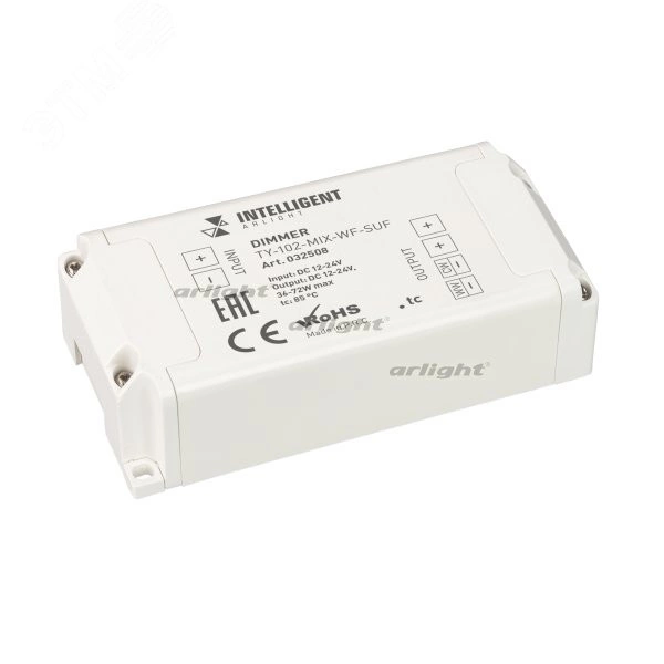 Диммер двухканальный, для светодиодных лент MIX (CCT, Tunable White), управляемый по WIFI плюс RF. Питание/рабочее напряжение 12-24VDC, максимальная нагрузка 2х3А, максимальная мощность 100W. Частота ШИМ 4kГц. WIFI 2.4ГГц. Управляется панелями серии TY-228-x-RF, совместим с платформой TUYA, и АЛИСА от ЯНДЕКС. Управление со смартфона через приложение INTELLIGENT ARLIGHT