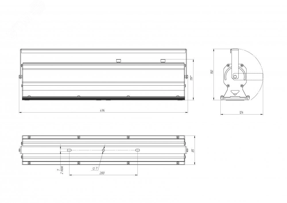 Корпус изготовлен из экструдированного алюминиевого профиля с анодированным покрытием. Торцевые крышки — штампованный алюминий. Источник питания установлен внутри корпуса.