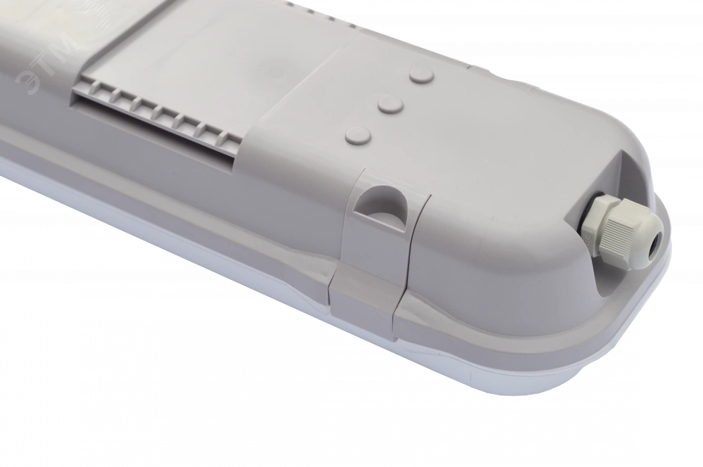 Корпус из негорючего АБС-пластика. Рассеиватель крепится к корпусу с помощью откидных клипс. Светодиодные платы устанавливаются на металлическую пластину, соединенную с корпусом поворотными винтами, облегчающими ее снятие, а также гибкими клипсами, обеспечивающими удобство обслуживания светильника на высоте.