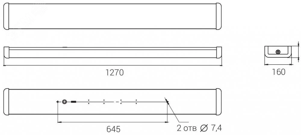 Модель в аварийном исполнении. Линейный светильник для административно-офисного освещения. Корпус из листовой стали, окрашенный белой порошковой краской. Торцевины белого цвета из ударопрочного полистирола крепятся к основанию с помощью винтов.