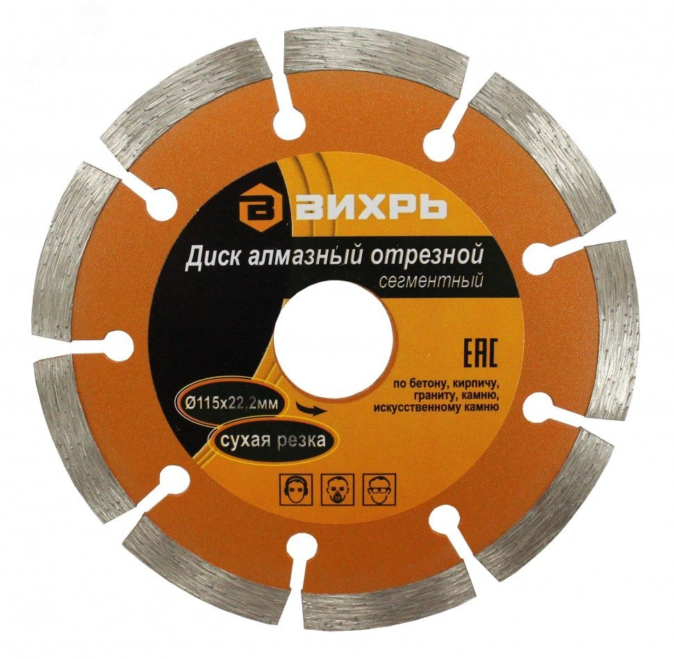 Диск алмазный отрезной сегментный 115 х 22,2 мм, сухая резка Вихрь - это алмазный отрезной диск, который используется совместно с угловыми шлифмашинами (болгарками) для сухой резки гранитных, бетонных, кирпичных и каменных изделий. Благодаря наличию «прорезей» сегментов в диске процесс обработки осуществляется с эффективным выбросом продуктов резания.