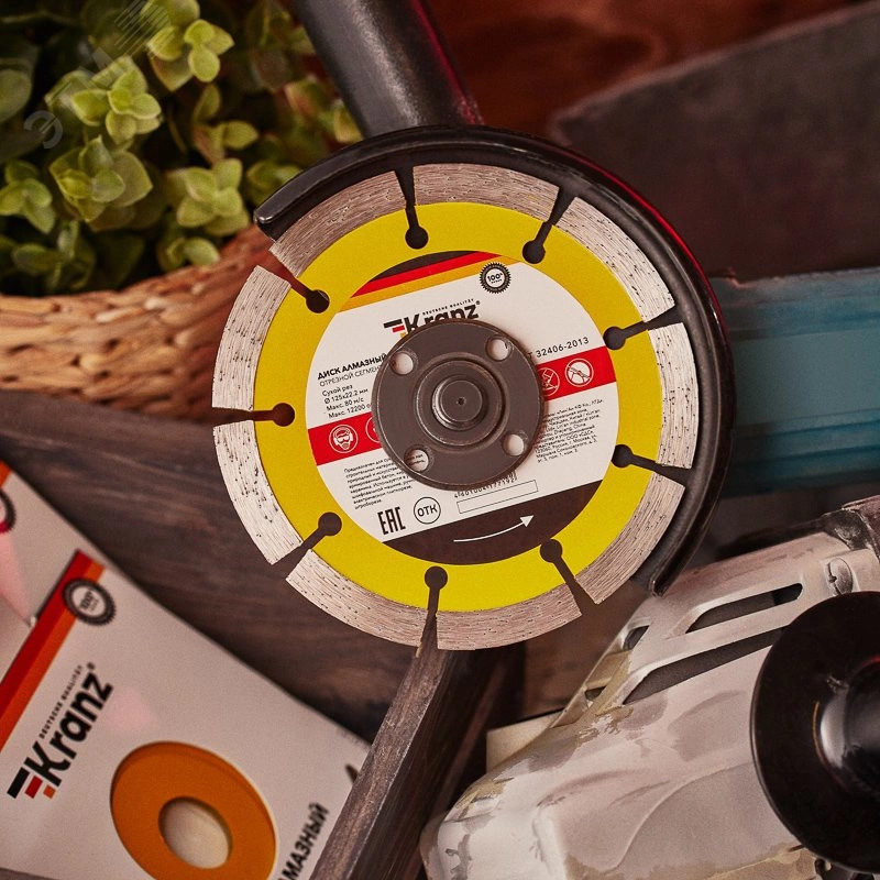 Диск алмазный отрезной сегментный KRANZ предназначен для сухой резки строительных материалов, таких как природный и искусственный камень, армированный бетон, кирпич, керамика. Используется в угловой шлифовальной машине, ручном электрическом плиткорезе, штроборезе. Состоит из алмазных сегментов и стального корпуса. Процесс резки сопровождается воздушным охлаждением. Срок годности не ограничен. Хранить в сухом прохладном месте. Использовать строго по назначению. Внимание. Запрещается использовать диск для разрезания металлов. При установке диска руководствуйтесь стрелкой направления вращения диска. Используйте средства индивидуальной защиты. Не утилизировать с бытовыми отходами.