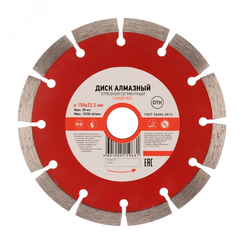 Диск алмазный отрезной сегментный KRANZ предназначен для сухой резки строительных материалов, таких как природный и искусственный камень, армированный бетон, кирпич, керамика. Используется в угловой шлифовальной машине, ручном электрическом плиткорезе, штроборезе. Состоит из алмазных сегментов и стального корпуса. Процесс резки сопровождается воздушным охлаждением. Срок годности не ограничен. Хранить в сухом прохладном месте. Использовать строго по назначению. Внимание. Запрещается использовать диск для разрезания металлов. При установке диска руководствуйтесь стрелкой направления вращения диска. Используйте средства индивидуальной защиты. Не утилизировать с бытовыми отходами.