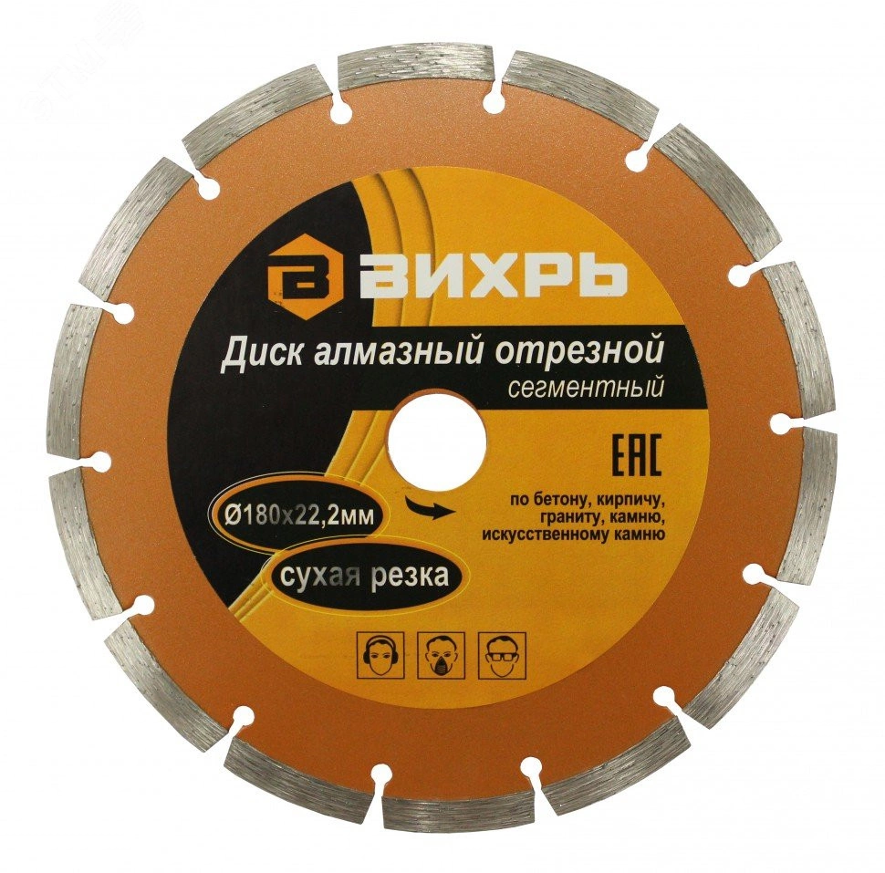 Диск алмазный отрезной сегментный 180 х 22,2 мм, сухая резка Вихрь - это алмазный отрезной диск, который используется совместно с угловыми шлифмашинами (болгарками) для сухой резки гранитных, бетонных, кирпичных и каменных изделий. Благодаря наличию «прорезей» сегментов в диске процесс обработки осуществляется с эффективным выбросом продуктов резания.