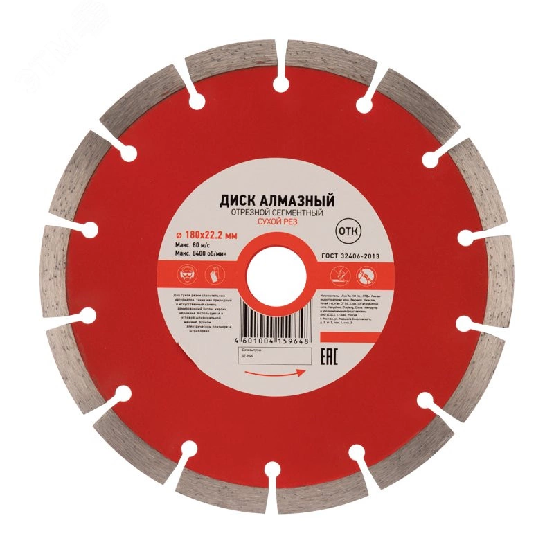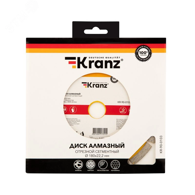 Диск алмазный отрезной сегментный KRANZ предназначен для сухой резки строительных материалов, таких как природный и искусственный камень, армированный бетон, кирпич, керамика. Используется в угловой шлифовальной машине, ручном электрическом плиткорезе, штроборезе. Состоит из алмазных сегментов и стального корпуса. Процесс резки сопровождается воздушным охлаждением. Срок годности не ограничен. Хранить в сухом прохладном месте. Использовать строго по назначению. Внимание. Запрещается использовать диск для разрезания металлов. При установке диска руководствуйтесь стрелкой направления вращения диска. Используйте средства индивидуальной защиты. Не утилизировать с бытовыми отходами.