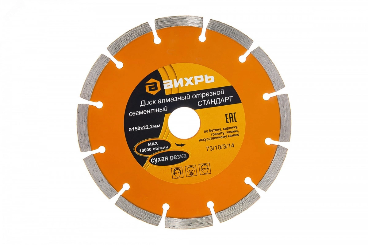 Диск алмазный отрезной сегментный СТАНДАРТ, 150 х 22,2 мм, сухая резка Вихрь - это алмазный отрезной диск, который используется совместно с угловыми шлифмашинами (болгарками) для сухой резки гранитных, бетонных, кирпичных и каменных изделий. Благодаря наличию «прорезей» сегментов в диске процесс обработки осуществляется с эффективным выбросом продуктов резания.