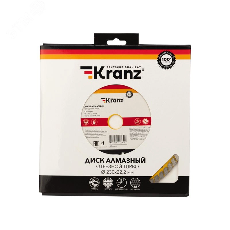 Диск алмазный отрезной Turbo KRANZ предназначен для сухой резки строительных материалов, таких как природный и искусственный камень, армированный бетон, кирпич, керамика. Используется в угловой шлифовальной машине, ручном электрическом плиткорезе, штроборезе. Материал изделия - инструментальная сталь, синтетический алмаз. Процесс резки сопровождается воздушным охлаждением. Срок годности не ограничен. Хранить в сухом прохладном месте. Использовать строго по назначению. Внимание. Запрещается использовать диск для разрезания металлов. При установке диска руководствуйтесь стрелкой направления вращения диска. Используйте средства индивидуальной защиты. Не утилизировать с бытовыми отходами.