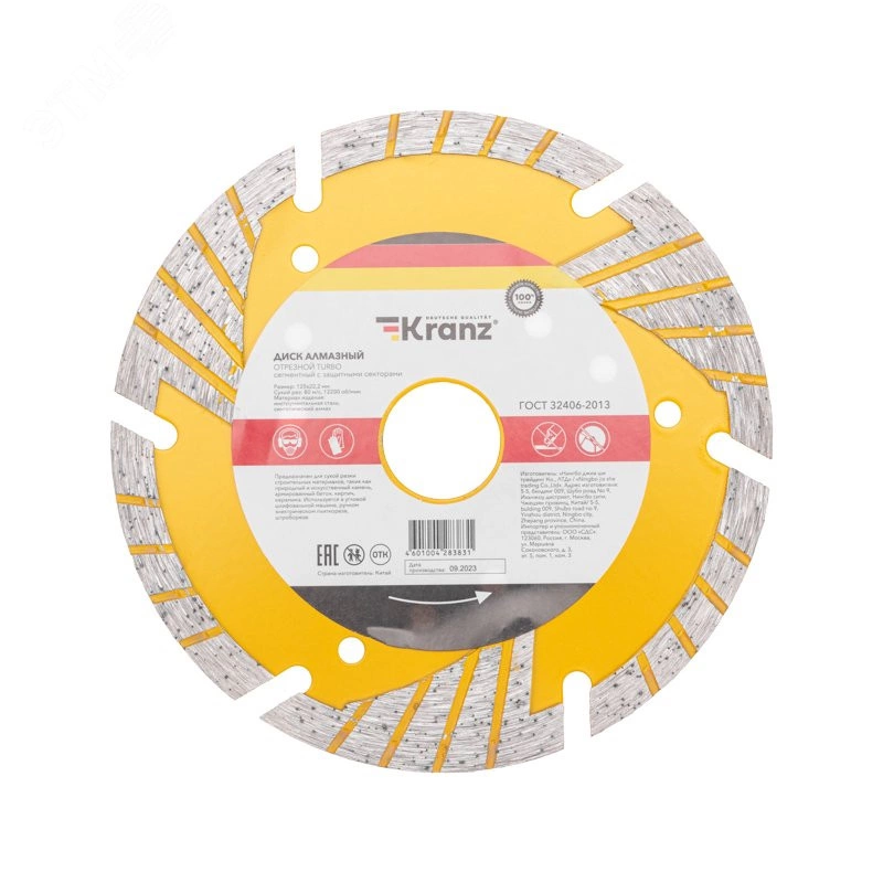 Диск алмазный отрезной Turbo KRANZ предназначен для сухой резки строительных материалов, таких как природный и искусственный камень, армированный бетон, кирпич, керамика. Используется в угловой шлифовальной машине, ручном электрическом плиткорезе, штроборезе. Диск оснащен защитными секторами, которые обеспечивают защиту режущего слоя от бокового износа, что значительно продлевает срок службы. Уникальная форма алмазных сегментов позволяет использовать диск без охлаждения, обеспечивает быстрый и аккуратный рез, позволяет выполнять кратковременную обработку боковой поверхностью без риска поломки. Диск выполнен из инструментальной стали и синтетического алмаза. Изготовлен методом горячего прессования, что значительно улучшает качество металлической связки и обеспечивает высокую концентрацию алмазов. Процесс резки сопровождается воздушным охлаждением.