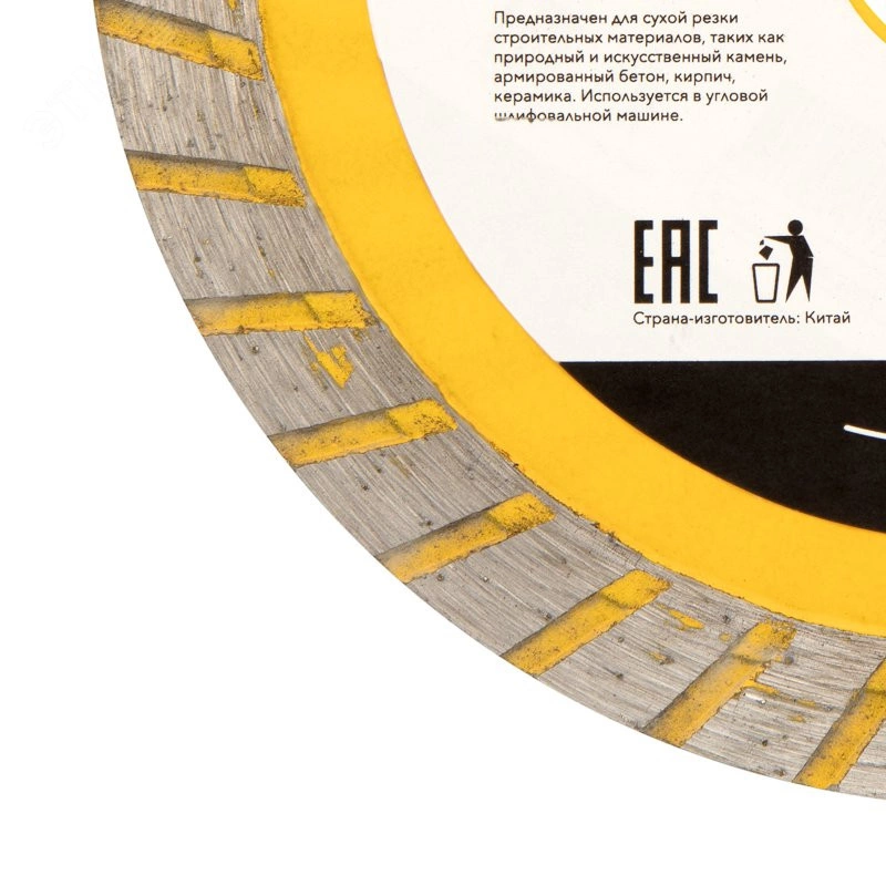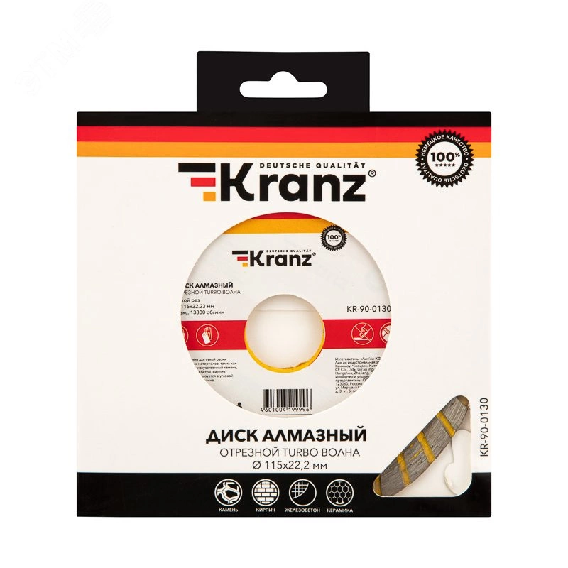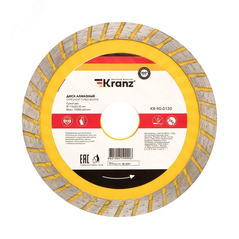 Диск алмазный отрезной Turbo волна KRANZ предназначен для сухой и влажной резки строительных материалов, таких как природный и искусственный камень, армированный бетон, кирпич, керамика. Используется в угловой шлифовальной машине, ручном электрическом плиткорезе, штроборезе. Материал изделия - инструментальная сталь, синтетический алмаз. Процесс резки сопровождается воздушным охлаждением. Срок годности не ограничен. Хранить в сухом прохладном месте. Использовать строго по назначению. Внимание! Запрещается использовать диск для разрезания металлов. При установке диска руководствуйтесь стрелкой направления вращения диска. Используйте средства индивидуальной защиты. Не утилизировать с бытовыми отходами.