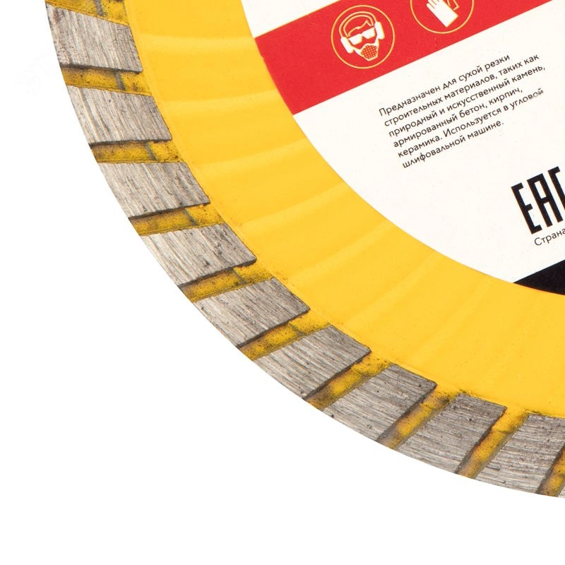Диск алмазный отрезной Turbo волна KRANZ предназначен для сухой и влажной резки строительных материалов, таких как природный и искусственный камень, армированный бетон, кирпич, керамика. Используется в угловой шлифовальной машине, ручном электрическом плиткорезе, штроборезе. Материал изделия - инструментальная сталь, синтетический алмаз. Процесс резки сопровождается воздушным охлаждением. Срок годности не ограничен. Хранить в сухом прохладном месте. Использовать строго по назначению. Внимание! Запрещается использовать диск для разрезания металлов. При установке диска руководствуйтесь стрелкой направления вращения диска. Используйте средства индивидуальной защиты. Не утилизировать с бытовыми отходами.