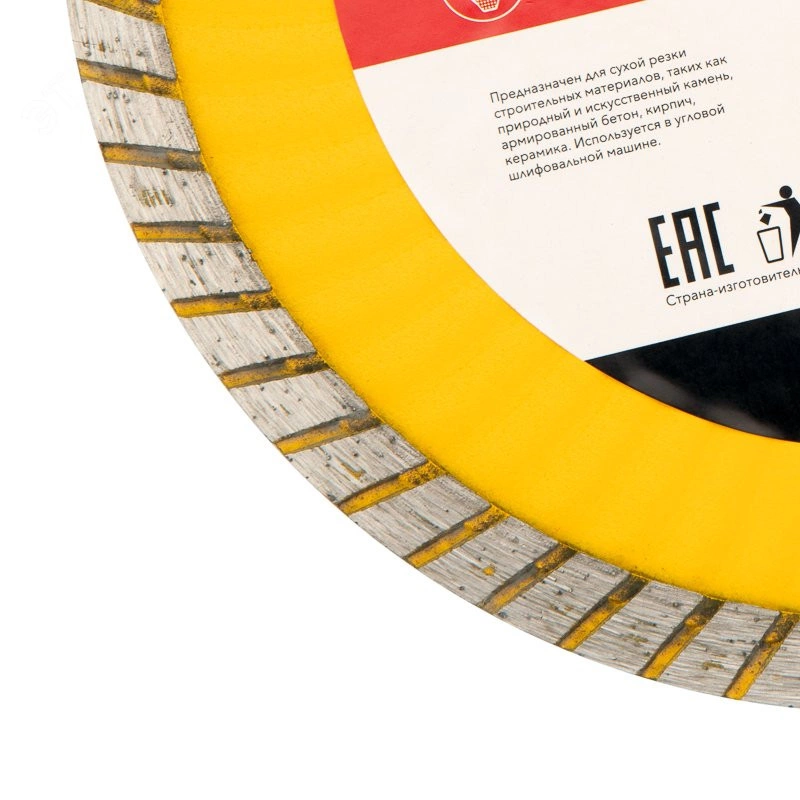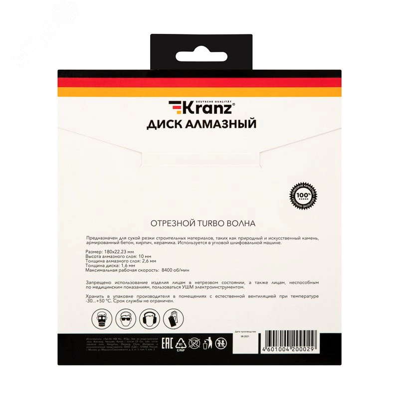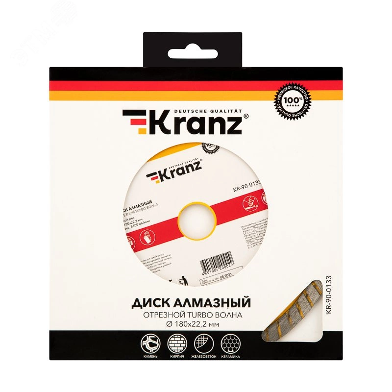 Диск алмазный отрезной Turbo волна KRANZ предназначен для сухой и влажной резки строительных материалов, таких как природный и искусственный камень, армированный бетон, кирпич, керамика. Используется в угловой шлифовальной машине, ручном электрическом плиткорезе, штроборезе. Материал изделия - инструментальная сталь, синтетический алмаз. Процесс резки сопровождается воздушным охлаждением. Срок годности не ограничен. Хранить в сухом прохладном месте. Использовать строго по назначению. Внимание! Запрещается использовать диск для разрезания металлов. При установке диска руководствуйтесь стрелкой направления вращения диска. Используйте средства индивидуальной защиты. Не утилизировать с бытовыми отходами.