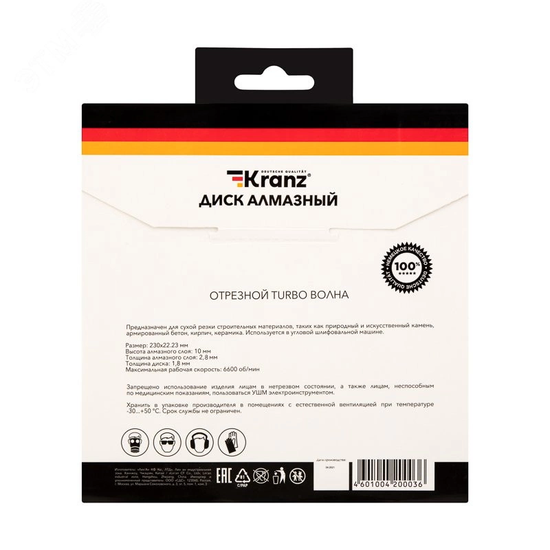 Диск алмазный отрезной Turbo волна KRANZ предназначен для сухой и влажной резки строительных материалов, таких как природный и искусственный камень, армированный бетон, кирпич, керамика. Используется в угловой шлифовальной машине, ручном электрическом плиткорезе, штроборезе. Материал изделия - инструментальная сталь, синтетический алмаз. Процесс резки сопровождается воздушным охлаждением. Срок годности не ограничен. Хранить в сухом прохладном месте. Использовать строго по назначению. Внимание! Запрещается использовать диск для разрезания металлов. При установке диска руководствуйтесь стрелкой направления вращения диска. Используйте средства индивидуальной защиты. Не утилизировать с бытовыми отходами.