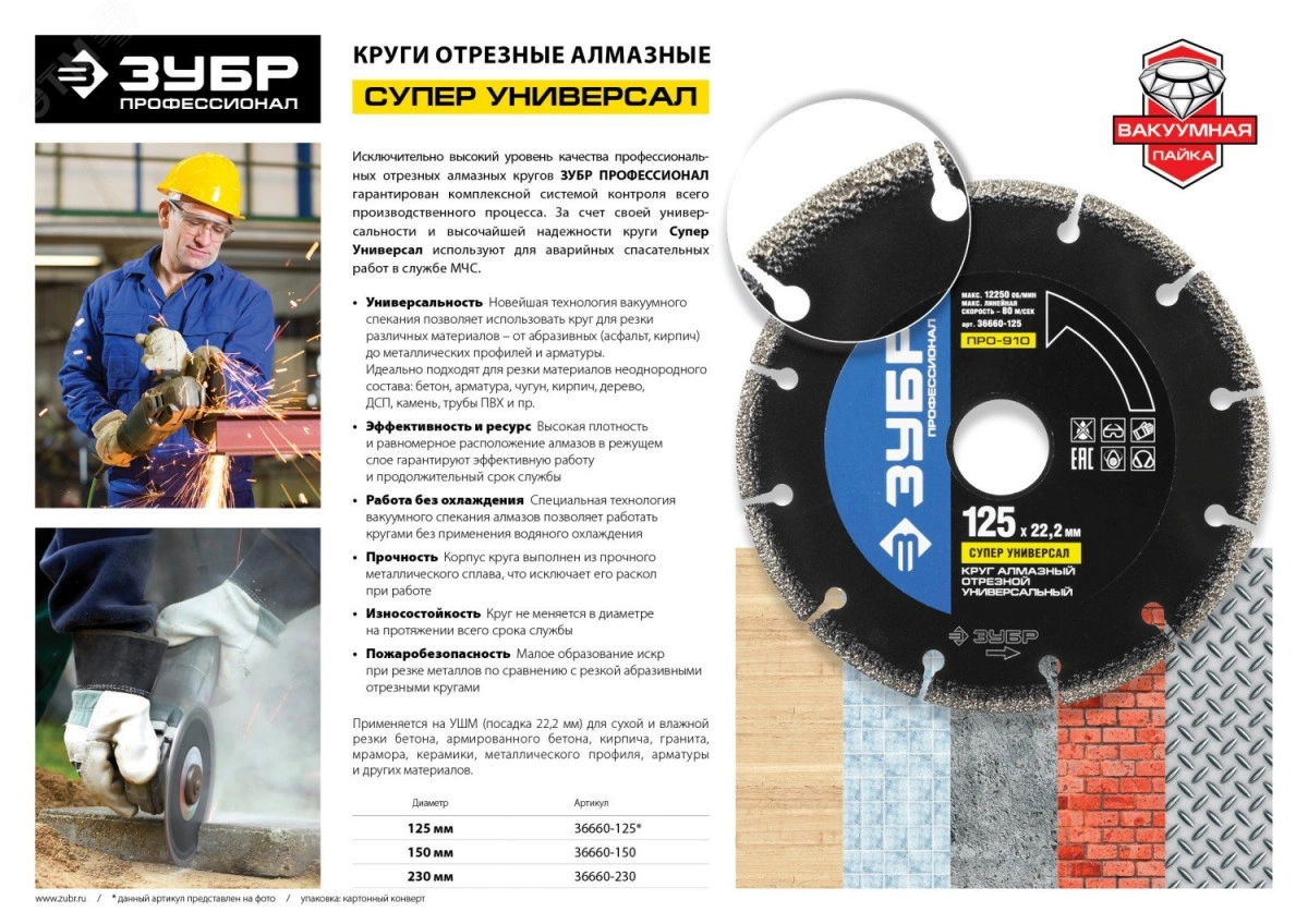 Исключительно высокий уровень качества отрезных алмазных дисков ЗУБР гарантирован комплексной системой контроля всего процесса производства: от качества поступающего сырья до готовой продукции. Корпуса алмазных дисков изготовлены из прочной легированной стали, способной выдержать значительную механическую нагрузку и высокую температуру.